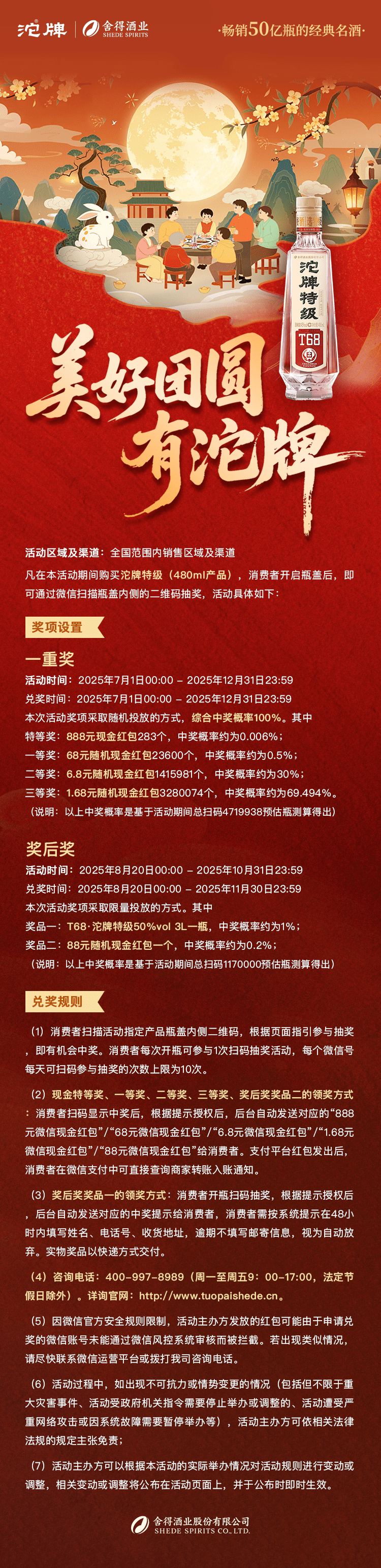 中秋喝特级T68 享豪礼双倍加码 扫产品盖内码即享2次抽奖机会